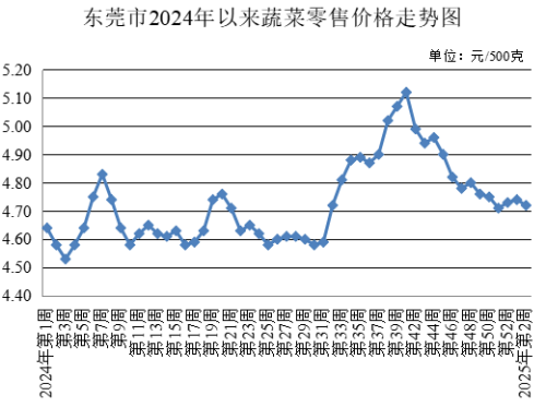 第2周,監(jiān)測的30種蔬菜農(nóng)貿(mào)市場零售均價為每500克4.72元,較上周下降0.42%。其中,葉菜類農(nóng)貿(mào)市場零售均價為每500克4.84元,較上周下降1.43%;非葉菜類農(nóng)貿(mào)市場零售均價為每500克4.63元,較上周上升0.22%。