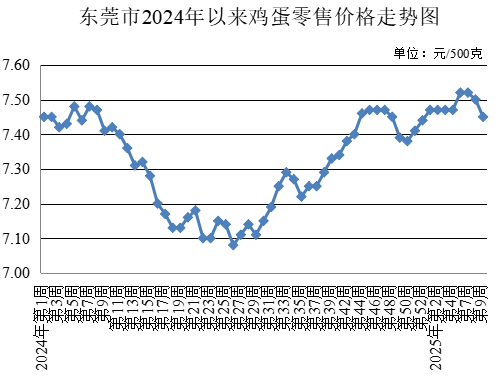 第9周,所監測的雞蛋農貿市場零售均價為每500克7.45元,較上周下降0.67%。