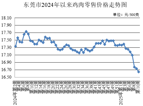 第10周,所監測的牛肉農貿市場零售均價為每500克46.64元,較上周上升0.11%。牛腩農貿市場零售均價為每500克43.08元,較上周下降0.02%。雞肉農貿市場零售均價為每500克16.64元,較上周下降0.54%。