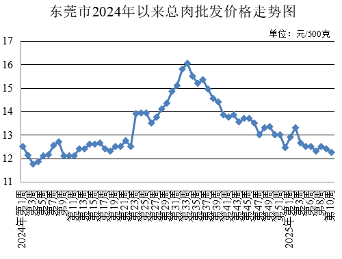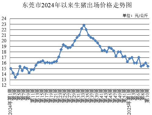 第10周,生豬出場價格為每公斤15.40元,較上周下降3.75%。總肉批發均價為每500克12.25元,較上周下降1.21%。